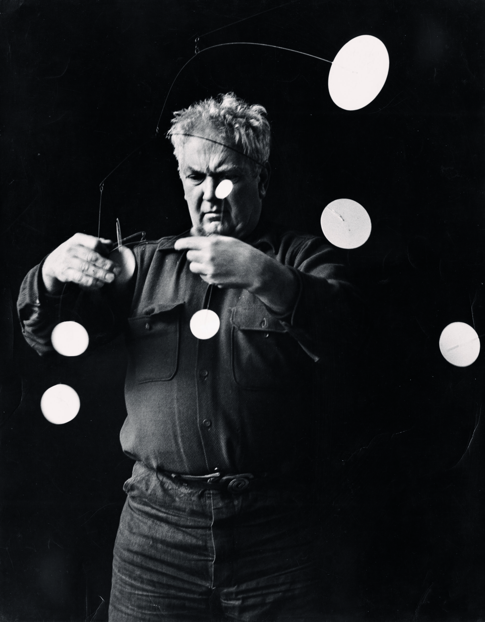 Tout commence à Paris. En 1926, Calder s’installe à Montparnasse. Il y invente un cirque miniature fait de fil de fer, de tissu et de poésie brute. Acrobates, clowns, cavaliers prennent vie sous ses doigts. Léger, Mondrian, Miró, Arp assistent aux représentations. Le spectacle est fragile, drôle, expérimental. L’art devient performance. Le geste devient œuvre.