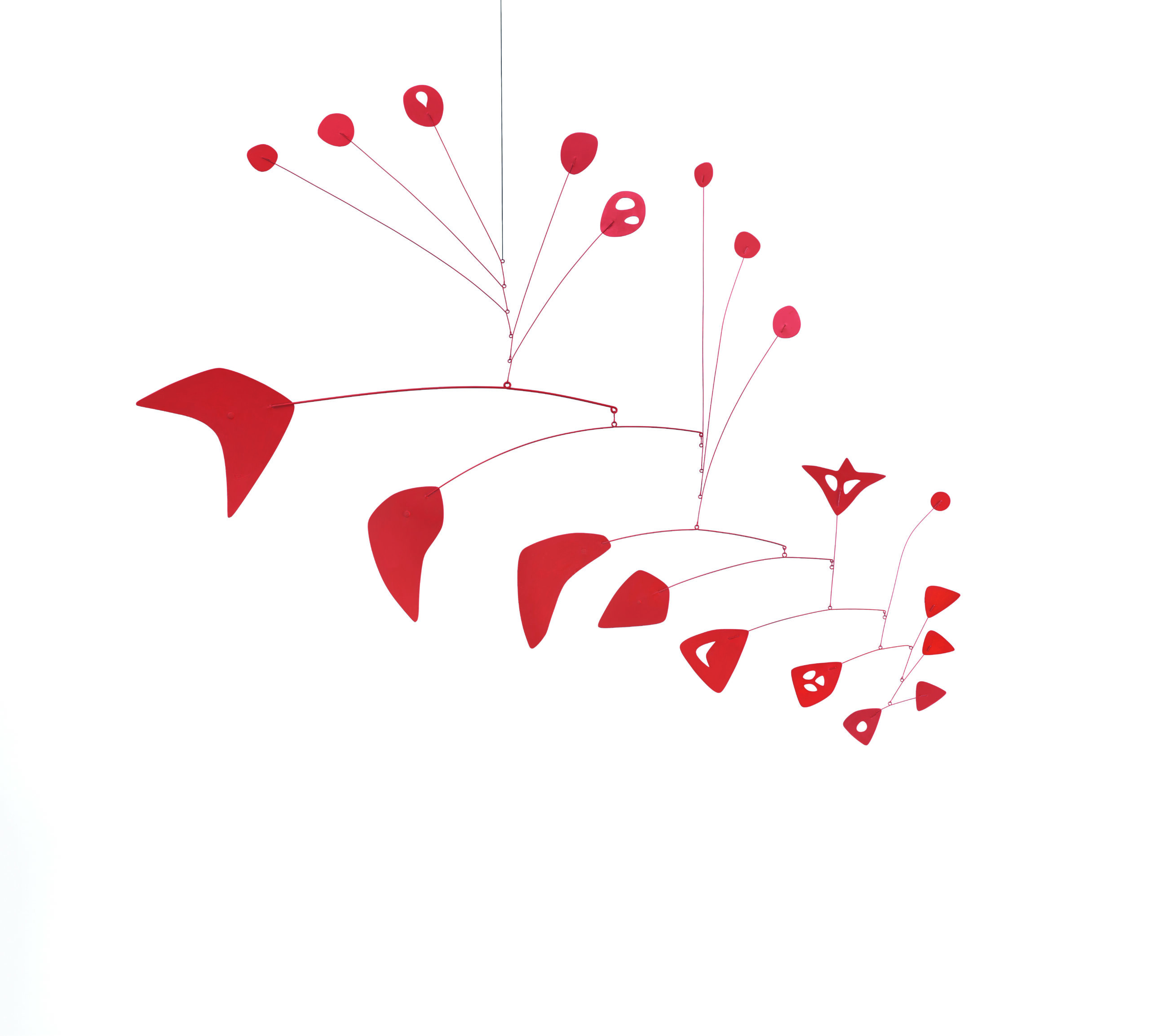 Puis survient la révolution abstraite. En 1932, Duchamp baptise « mobiles » ces sculptures animées par l’air. Calder libère la forme du socle, introduit le temps comme matière. Les œuvres frémissent, oscillent, projettent des ombres instables. Arp nomme « stabiles » leurs contrepoints immobiles. Entre équilibre et gravité, vide et plein, silence et bruissement, Calder invente une grammaire inédite.