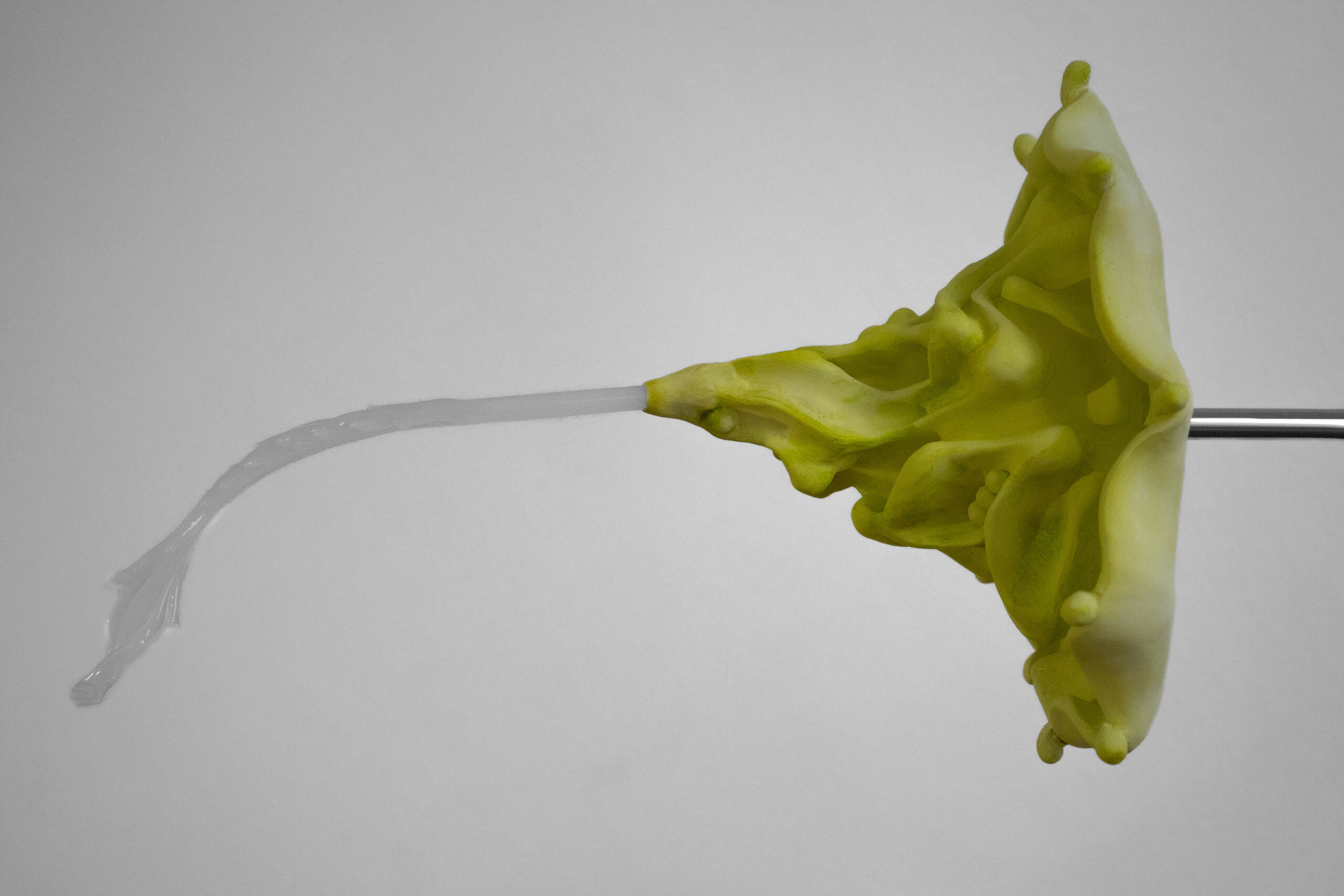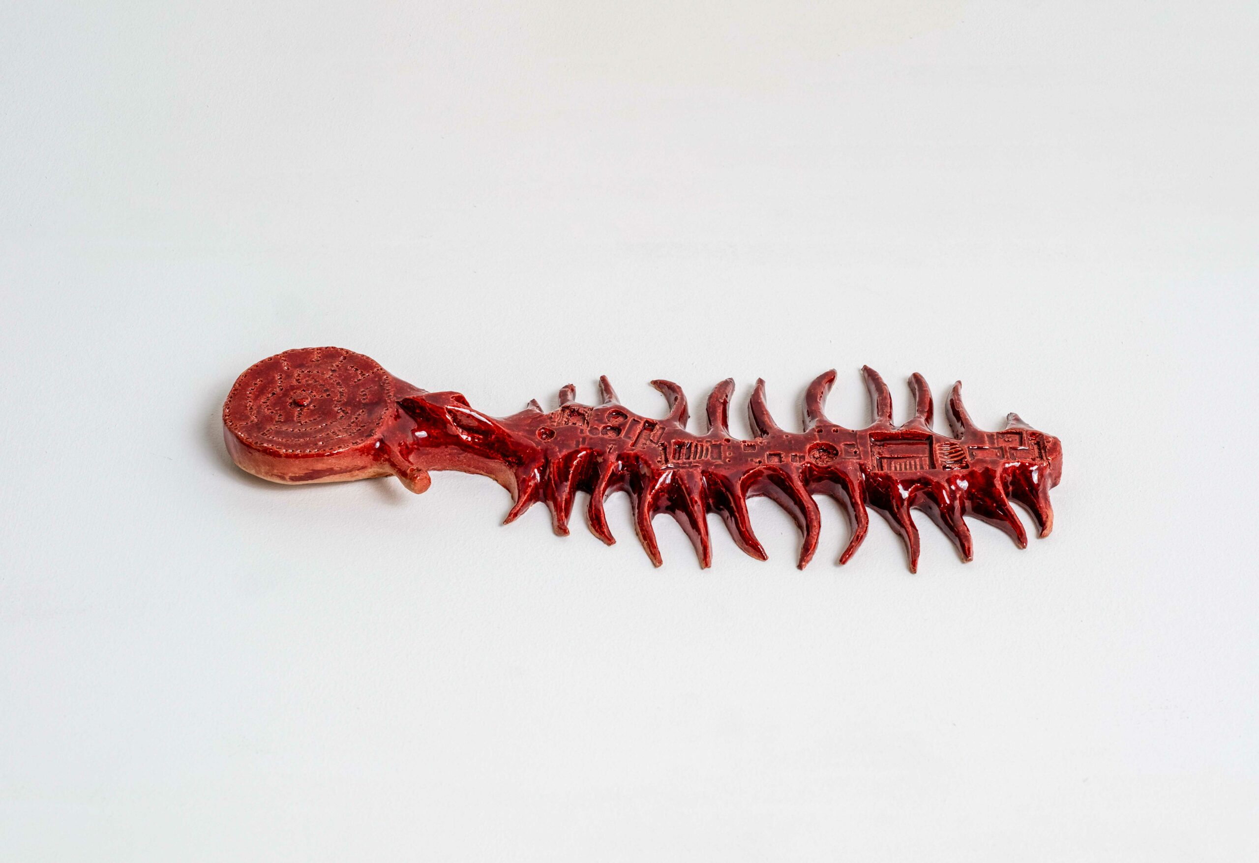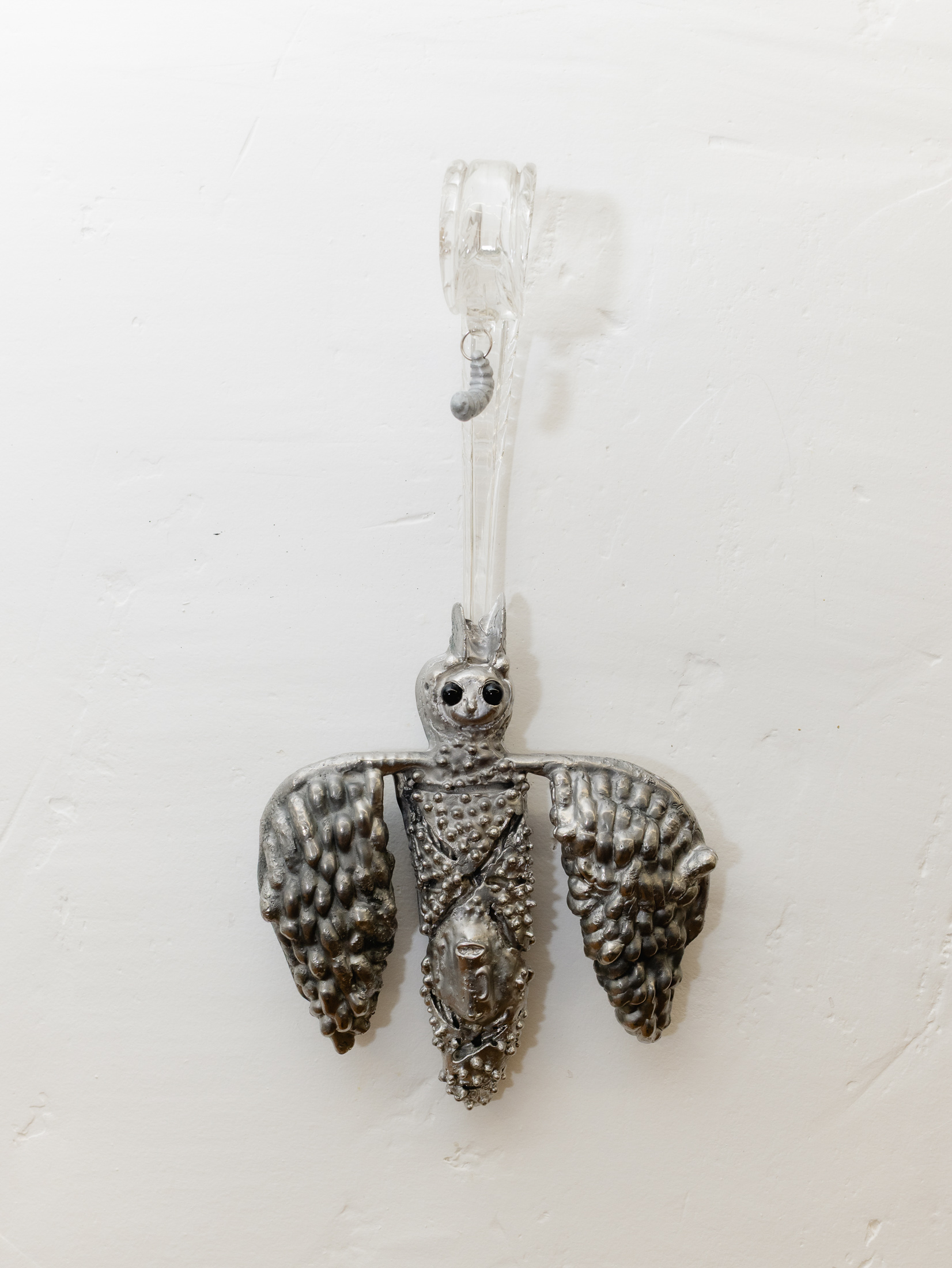 Décomposition, foudre, radioactivité, autant de zones de transition capables d’ouvrir nos émotions les plus complexes. Son vocabulaire naît de techniques artisanales et de matières instables : sève de pin, colle d’os, cire d’abeille, goudron de bouleau. Elle moule le vivant, assemble, modèle entre bois, métal et céramique : une ambiguïté volontaire persiste, comme une question laissée en suspens. Formée et nourrie par des rencontres, notamment avec Anna Hulacová, Laure Prouvost, Frederik Exner et Antoine Liebeart, elle développe aussi ses pratiques au fil de résidences : au studio Ernan à Albissola Superiore (ancien studio de Lucio Fontana) en 2022 et 2025, puis à la Villa Belleville en 2026. Elle a obtenu un master à l’École Duperré en 2023 et a présenté son travail dans des institutions telles que la Ménagerie de Verre, l’Institut suédois, et le Musée de la Chasse et de la Nature. Ses sculptures, composées comme des mécanismes, empruntent au théâtre de marionnettes autant qu’au stop motion : des corps en latence, prêts à ne pas s’activer, mais à contrarier leur propre immobilité. Poésie, fanzines et récits circulent aussi avec elle, jusqu’aux collections du Zentralinstitut für Kunstgeschichte à Munich, tandis qu’elle appartient au collectif Royal Book Lodge.