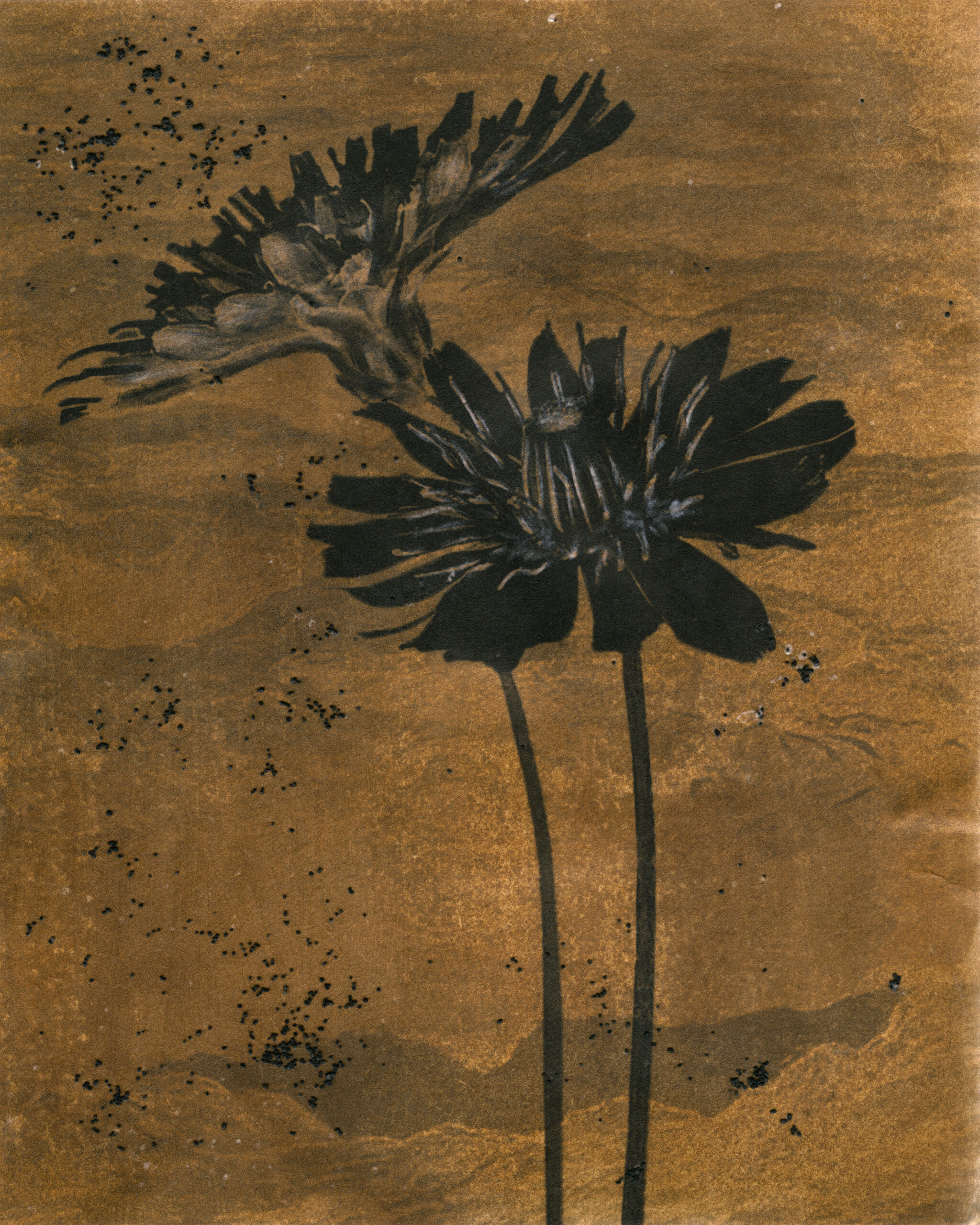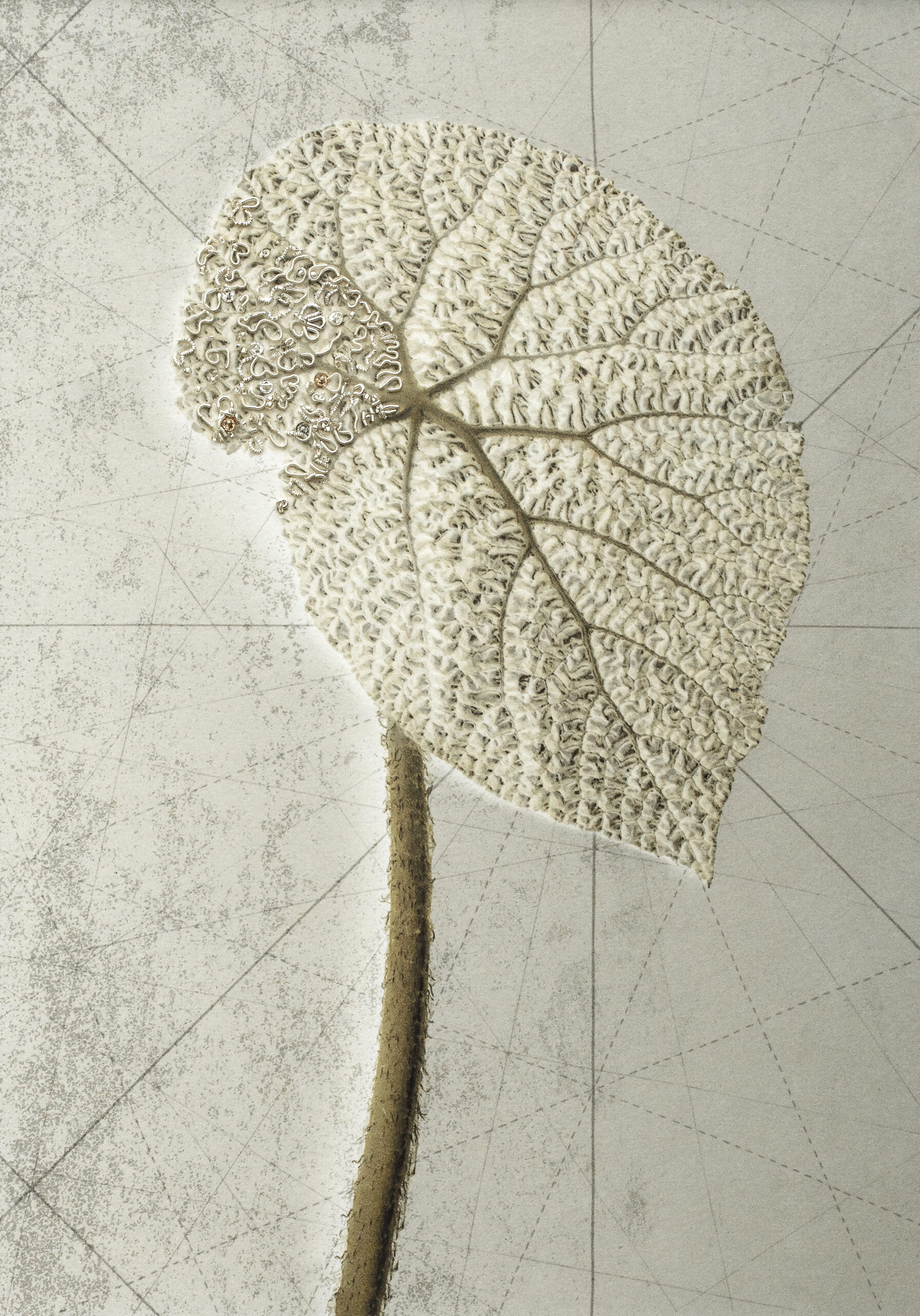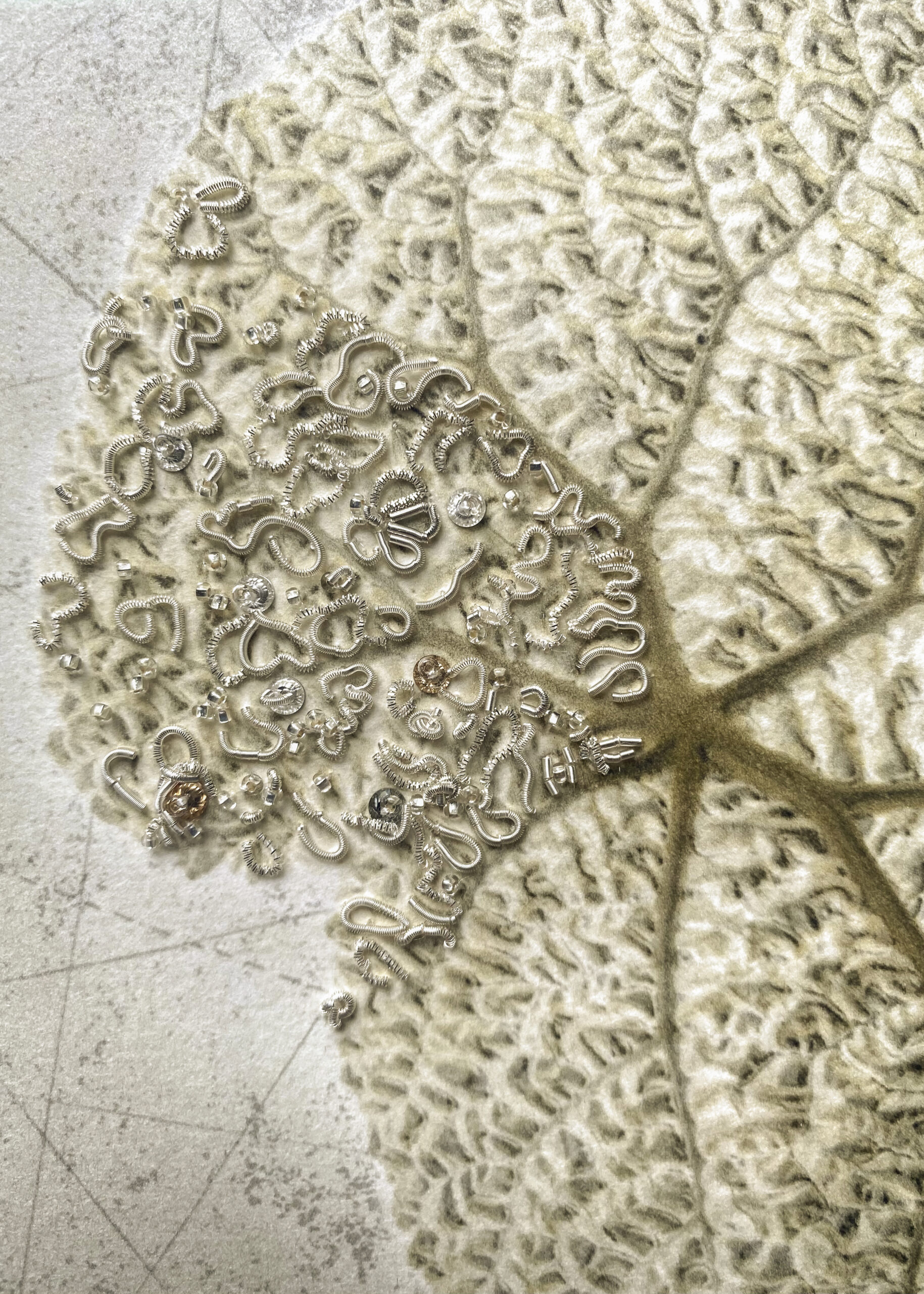 Les interventions de Sylvie Deschamps, brodeuse au fil d’or, transcendent ces images, débanalisant la plante pour lui offrir une nouvelle existence, vibrante de beauté. Ensemble, elles composent une symphonie visuelle où le passé et le présent dansent en harmonie, révélant les strates de notre monde et l’urgence d’un dialogue renouvelé.
